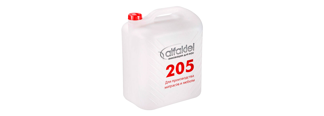 Альфаклей 205 невоспламеняемый контактный клей, обладающий высокой проникающей способностью. Образует тонкий незаметный клеевой шов. Используется при производстве матрасов и мягкой мебели.